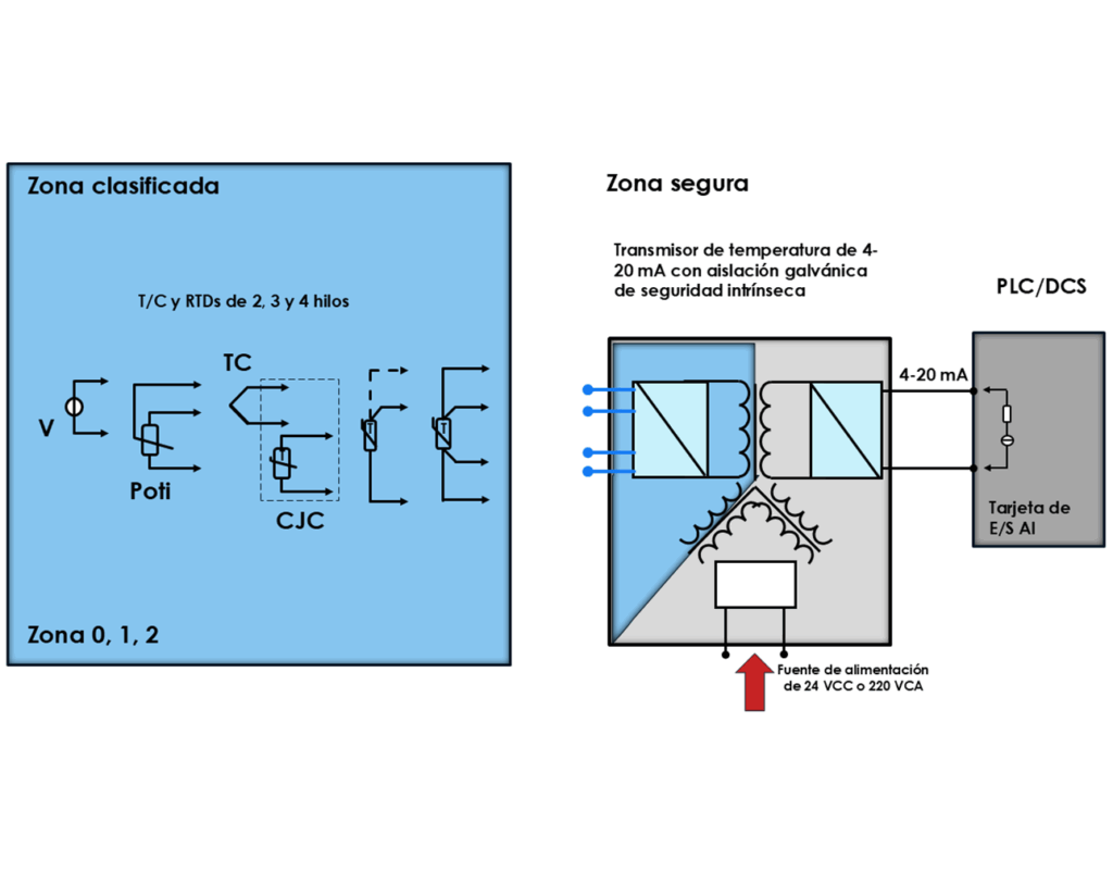 Figura 6. Esquema de un transmisor de temperatura de 4-20 mA intrínsecamente seguro y aislado galvánicamente
