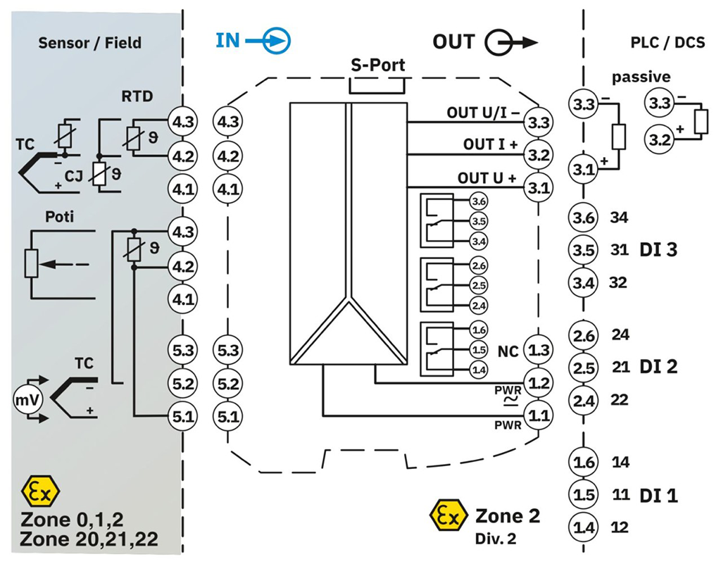 Para estas aplicaciones, los transmisores montados en riel DIN pueden incluir un aislamiento galvánico de seguridad intrínseca. Si este es el caso, no se requieren barreras adicionales.